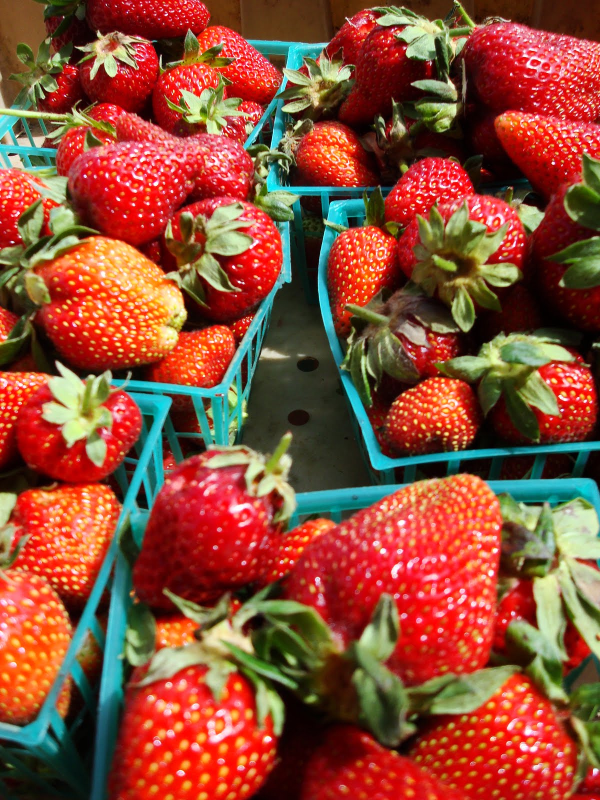 Anyway, on Sunday, we went back to the farm, slathered on some sunscreen and joined about a hundred other folks who were also out picking. Lots and lots of kids, which I can’t imagine trying to wrangle and explain the art of strawberry picking to. Strawberries grow close to the ground, the plants probably only grow about 10 inches, and the berries often lay directly on the ground – there is a lot of reaching and bending involved. Even so, Dan and I persevered and picked about 5.5 pounds of berries to take home with us. We just finished cutting them all up for dessert tonight and we picked them almost 2 weeks ago. I’m super impressed with how long they’ve kept in our fridge.